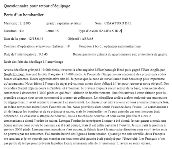 A la fin de l’année 1983, Monsieur Marius ABLIN décédait à la résidence Pierre Bolle d’Arras. C’était un charmant vieillard qui avait gardé l’esprit vif, des sentiments laïcs et de fidèles amitiés. J’ai eu le plaisir de le rencontrer voici 18 mois et je retranscris ici le témoignage qu’il a bien voulu me confier : “J’habitais à Givenchy en Gohelle, rue Marcel Sembat. J’avais épousé une fille de Givenchy (décédée en 1958) Madeleine Capron et nous logions à côté de la maison de mes beaux-parents. Le 13 juin 1944, une semaine juste après le débarquement, on était couchés. Il pouvait être entre 21h et 22h. Nous avions déjà eu beaucoup d’alertes. Tout d’un coup, ma belle-mère qui n’était pas couchée crie : “Marius ! Madeleine ! Levez-vous ! Il y a une alerte !” Elle voyait un avion en flammes arriver sur le village. Il avait passé au dessus de Lens. On s’est donc relevés avec les deux enfants (Paulette et Chantal) pour aller nous mettre à l’abri dans la cave de ma belle-mère qui était particulièrement solide, d’autant qu’elle avait été renforcée par les PTT (il y avait une cabine téléphonique). Tout à coup, on entend un bruit formidable, épouvantable. L’avion avait tenté d’atterrir dans le jardin. Mais il avait buté sur un talus de gravas de la guerre 14 et s’était retourné. Il avait perdu 15 bombes, des grosses bombes, en se retournant. Pas une n’a explosé sur le coup. Mais un incendie s’est déclaré et a provoqué l’explosion d’une bombe. Ma petite maison a été totalement soufflée, ratatinée. Je suis sorti vers 6h moins le quart pour aller au travail et j’ai été voir les ruines de ma maison. A peine étais-je parti que, à 6 heures du matin, une autre bombe explosait dans les décombres. Le drame a été fini. On en est tous sortis intacts. Il n’y a pas eu d’enterrement. Les Allemands qui étaient venus le jour de l’explosion nous avaient interdit l’approche des lieux. Ils ont enlevé les débris de l’appareil. Depuis cette date j’ai logé dans le groupe scolaire de Givenchy en Gohelle jusqu’à mon départ pour Arras. Je suis sûr que c’est la date du 13 juin. Je crois que ce jour-là les boches ont abattu 4 forteresses volantes : une à Ecurie, une aux Hochettes, une à Givenchy-en-Gohelle et une …je ne sais plus où. Il n’y a pas eu d’enterrement. D’ailleurs, à part le tronc, il n’y avait pas grand-chose à enterrer. Par la suite, une famille anglaise est venue reconnaître un corps à je ne sais plus quel détail. Il n’y a eu aucune cérémonie, ni à la mairie, ni à l’église. Je ne sais rien de plus.”